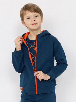 Толстовка с длинными рукавами, притачным поясом и манжетами. Манжеты выполнены из полотна с добавлением лайкры, пояс выполнен из основного полотна. Капюшон со шнурком и подкладкой, верхняя часть декорирована вязаной нашивкой. Перед декорирован принтом "Катайся каждый день".