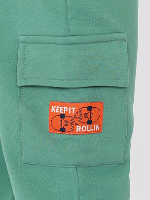Брюки с притачным поясом и манжетами. В пояс вставлена резинка и функциональный шнур. Пояс и манжеты выполнены из полотна с эластаном. На боковых швах расположены накладные карманы с клапаном. Карман декорирован вязаной нашивкой.