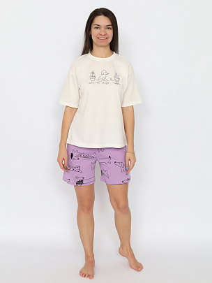 Пижама комбинированная из футболки и шорт. Футболка оверсайз с коротким рукавом выполнена из гладкокрашеного полотна. Горловина обработана притачной бейкой из рибаны с лайкрой. Перед оформлен принтом. Шорты свободного покроя длиной до середины бедра выполнены из набивного полотна дополнительного цвета. Цельнокроенный пояс обработан плоским швом вподгибку с одновременным прокладыванием резинки.