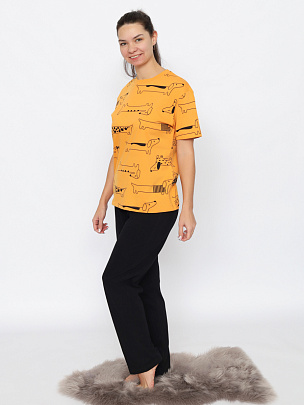 Комбинированная пижама из футболки и брюк. Футболка набивная, небольшого объёма, длиной до линии бёдер, с коротким рукавом. Горловина обработана притачной бейкой из рибаны с лайкрой. Прямые брюки умеренного объёма выполнены из гладкокрашеного полотна. Цельнокроенный пояс обработан плоским швом вподгибку с одновременным прокладыванием резинки.