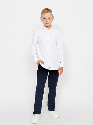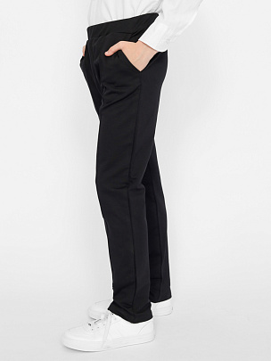 Брюки с притачным поясом из основного полотна и резинкой внутри. На передних половинках расположены карманы и отстроченные стрелки.