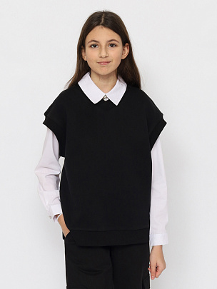 Школьный жилет оверсайз для девочки - это прекрасный выбор для тех, кто ценит комфорт и стиль. Жилет выполнен из мягкого и приятного к телу футера, что обеспечивает комфортное ношение в течение всего дня. Благодаря своему свободному крою и широким проймам модель обеспечивает свободу движений, что делает жилет идеальным для активных девочек. Акцентной деталью этого жилета является разрезы по бокам, которые придают ему оригинальности и удобства в носке. Особенности жилета включают треугольный в...