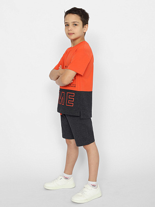 Комбинированная футболка с короткими рукавами. Горловина круглая, обработана узким воротником из полотна с эластаном. Перед футболки с горизонтальным швом чуть ниже линии груди. Перед футболки декорирован принтом "время машин". Шорты с боковыми карманами. Пояс притачной, с резинкой внутри и шнуром.