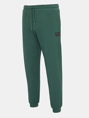 Брюки на манжетах внизу. Отрезной пояс выполнен из основного полотна. В поясе функциональный кругловязаный шнур вставлен в петли. Карманы наклонные в боковых швах. Декорированы жаккардовой этикеткой.