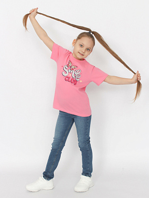 Футболка с коротким рукавом. Горловина круглая, обработана узким воротником из полотна с эластаном. Перед оформлен принтом с использованием краски с эффуктом "металлик".